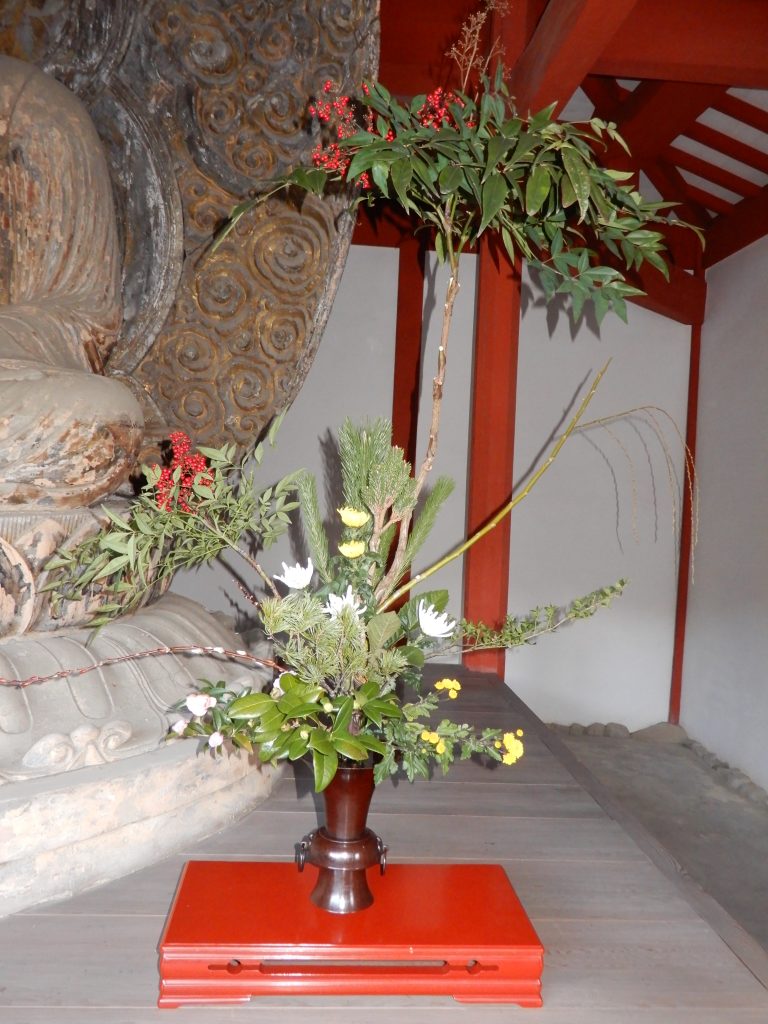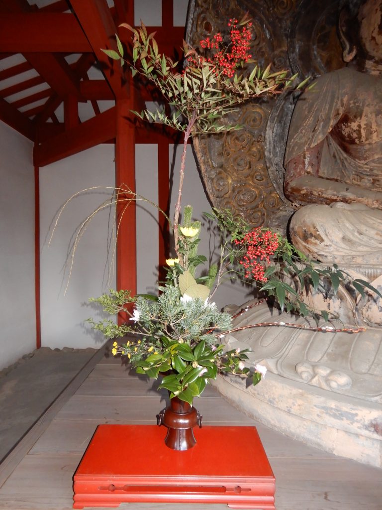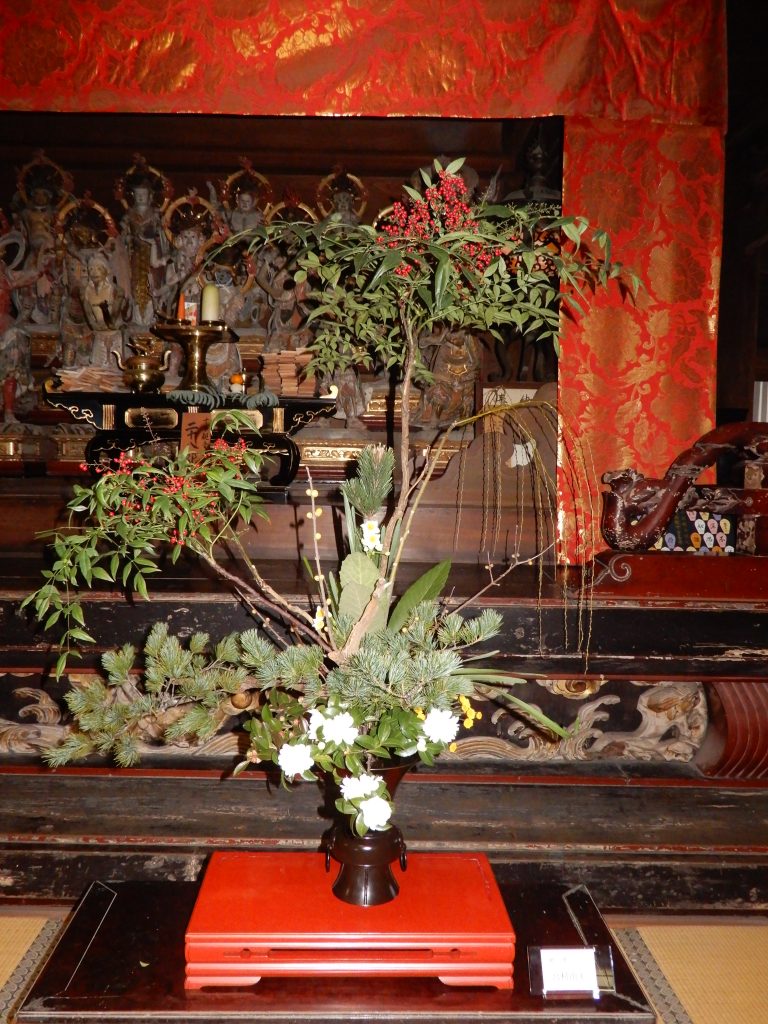 本堂に華道家元池坊の宮村由美先生が、丈六堂に兼崎順子先生と行武真由美先生が「迎春の花」を献華していただきました。