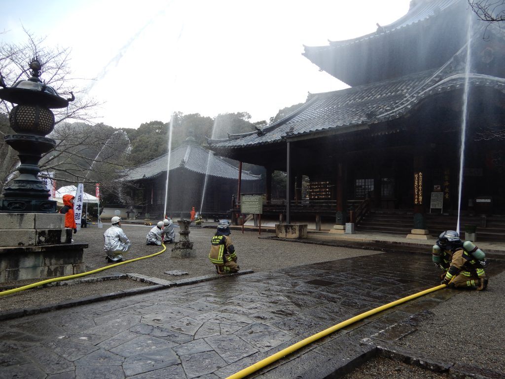 訓練では、重要文化財である千手堂から出火したという想定で、放水消化、文化財の搬出などを行いました。